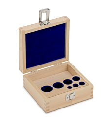 Juego de pesas, E1, 1 mg - 200 g, Botón, acero inoxidable pulido, en un estuche de madera