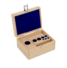 Juego de pesas, E1, 1 mg - 500 g, Botón, acero inoxidable pulido, en un estuche de madera
